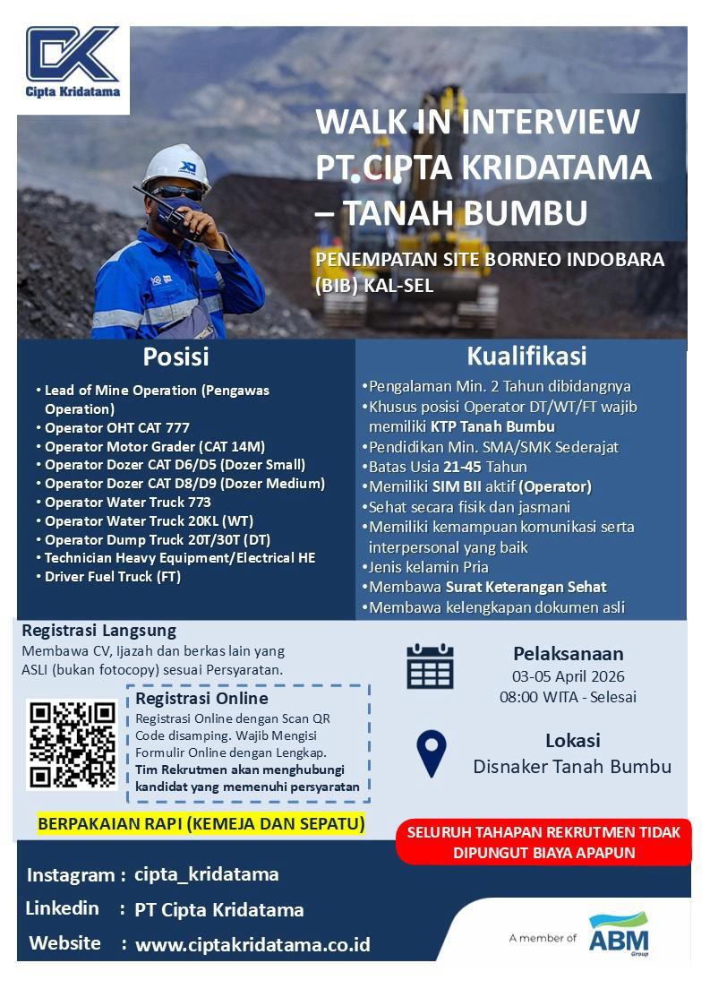 BATULICIN — PT Cipta Kridatama membuka kesempatan kerja bagi masyarakat Tanah Bumbu melalui kegiatan walk in interview yang akan dilaksanakan pada 3–5 April 2026 di halaman Kantor Disnakertrans Tanah Bumbu. Rekrutmen ini ditujukan untuk penempatan di site Borneo Indobara (BIB).